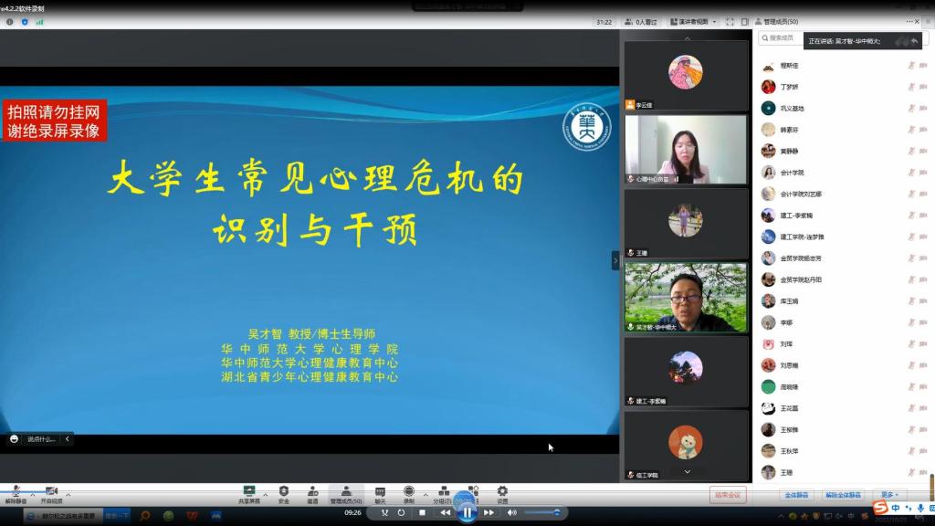 为提高beat365学生工作队伍心理健康意识与观念,使辅导员队伍熟悉和掌握大学生心理危机的应对方法,提升心理育人能力,确保学校心理健康教育与校园安全稳定工作扎实有序开展。10月21日下午,心理健康教育中心组织召开“心理危机的识别与干预”线上专题讲座,此次讲座邀请到华中师范大学心理学院吴才智教授,由心理健康教育中心贠芸科长主持,全体学工队伍、专兼职心理健康教育教师及咨询师参加。