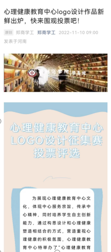为展现心理健康教育中心文化,体现中心服务宗旨,传承中心精神,同时培养学生自主创新能力,提高学生心理健康教育系列活动参与度,学校心理健康教育中心于10月17日-11月10日期间,面向全体学生组织开展心理健康教育中心LOGO设计征集赛,通过巧妙构思设计和心理健康塑造相结合的方式,营造重视心理健康的积极氛围,提升学生心理保健意识。