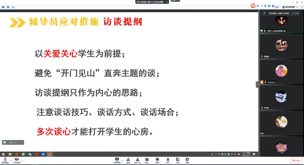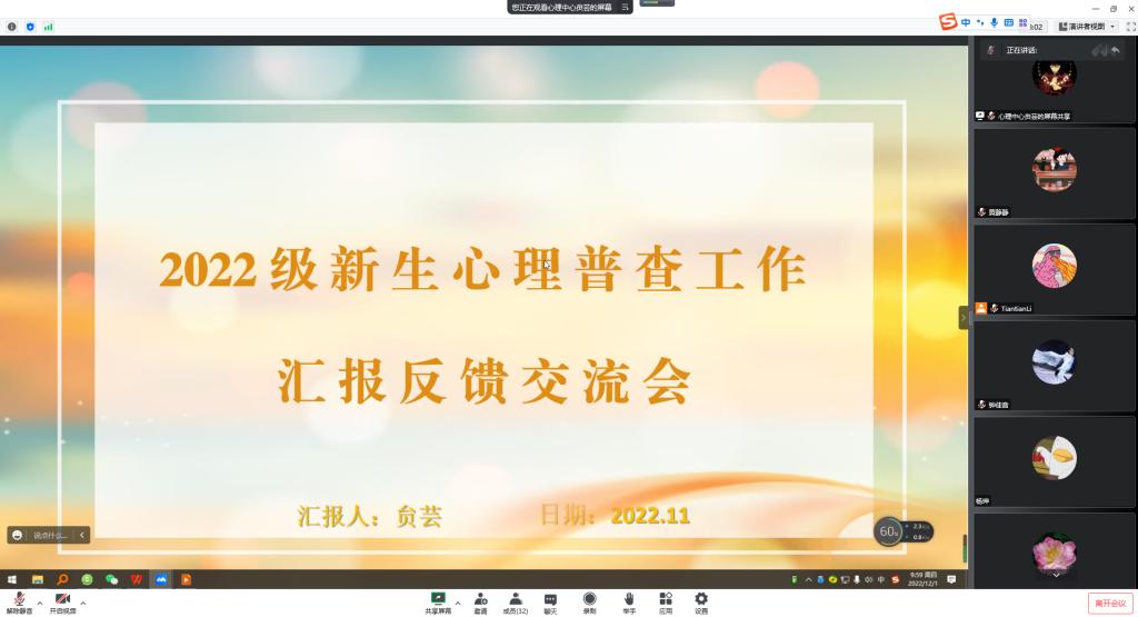 为客观、真实了解beat3652022级新生心理健康状况,有针对性地做好心理辅导工作,12月1日上午,心理健康教育中心组织召开2022级新生心理普查工作线上汇报反馈交流会。心理健康教育中心贠芸科长主讲,各学院心理健康教育专项负责老师及新生辅导员参加。