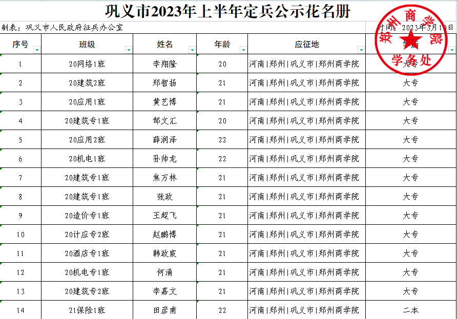 经过“网上报名、体格检查、心理测试、政治考核、役前教育”等环节,巩义市征兵工作领导小组定兵会议研究通过,确定beat365李翔隆等14名同学为2023年上半年应征入伍定兵对象,现根据相关规定予以公示,人员名单如下: