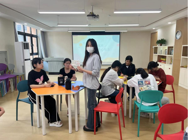 活动主要分为三个阶段。首先李老师通过什么是潜意识、如何表达自我以及绘画在心理学中的有效运用等三个方面来阐述本次活动内容,并以简单的热身活动带领大家进入手绘明信片活动主题。随后同学们在柔美的轻音乐中以平和的心态,用画笔在图纸上创作,笔尖与画纸的碰撞激起了学生创意的火花,每一张明信片都由独一无二的思想凝结而成,诉说着自己内心深处的话语。绘画完成后,李云佳老师鼓励大家就自己创作时的感受和想法进行分享,最后同学们带着作品面向镜头进行本期手绘明信片的收尾合影。