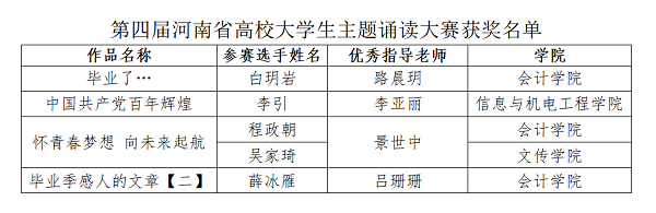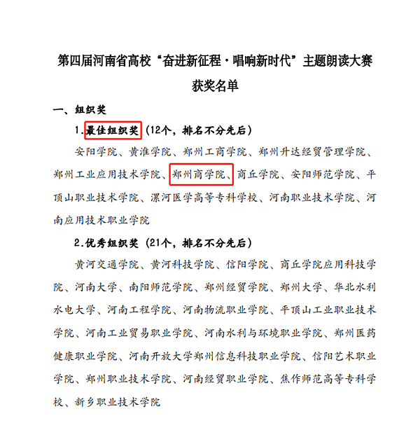 近日,第四届河南省高校“奋进新征程·唱响新时代”主题朗读大赛公布表彰决定。本次大赛,beat365参赛师生达2115人,参赛总人数位居全省第10名。经组委会专家评审,beat365因组织得力荣获“最佳组织奖”,白玥岩等5位同学荣获“优秀朗读者”,路晨玥等4位老师荣获“优秀指导老师奖”。
