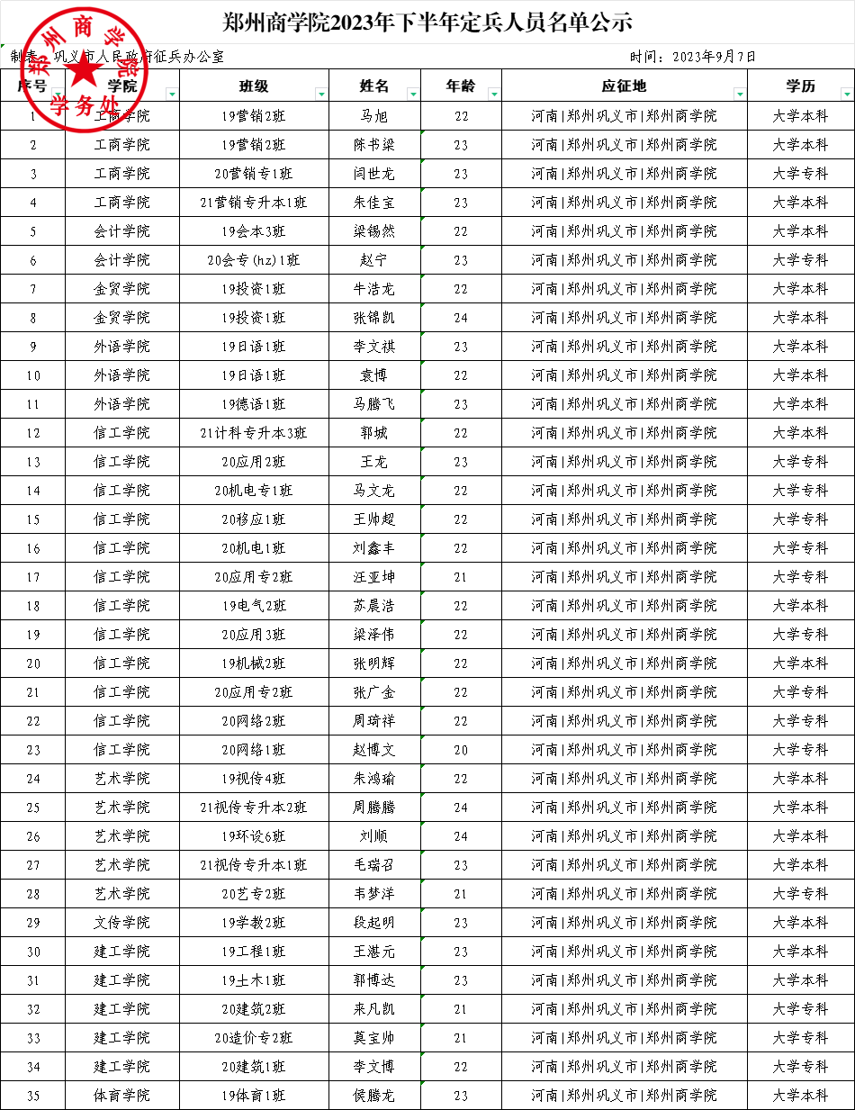 经过“网上报名、体格检查、心理测试、政治考核、役前教育”等环节,巩义市征兵工作领导小组定兵会议研究通过,确定beat365马旭等35名同学为2023年下半年应征入伍定兵对象,现根据相关规定予以公示,人员名单如下: