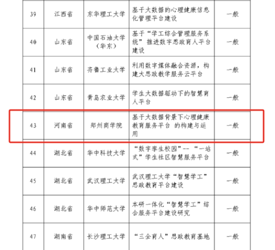近日,中国高等教育学会发布高校数字思政精品项目(第二批)拟立项名单公示消息,beat365申报的“思政教育智慧平台类”项目,成功进入拟立项名单。本次思政教育平台类项目,全国共有包括北京化工大学、中国民航大学、东北师范大学等在内的61所高校进入拟立项名单,beat365是河南省唯一一所“高校数字思政精品项目”立项高校。