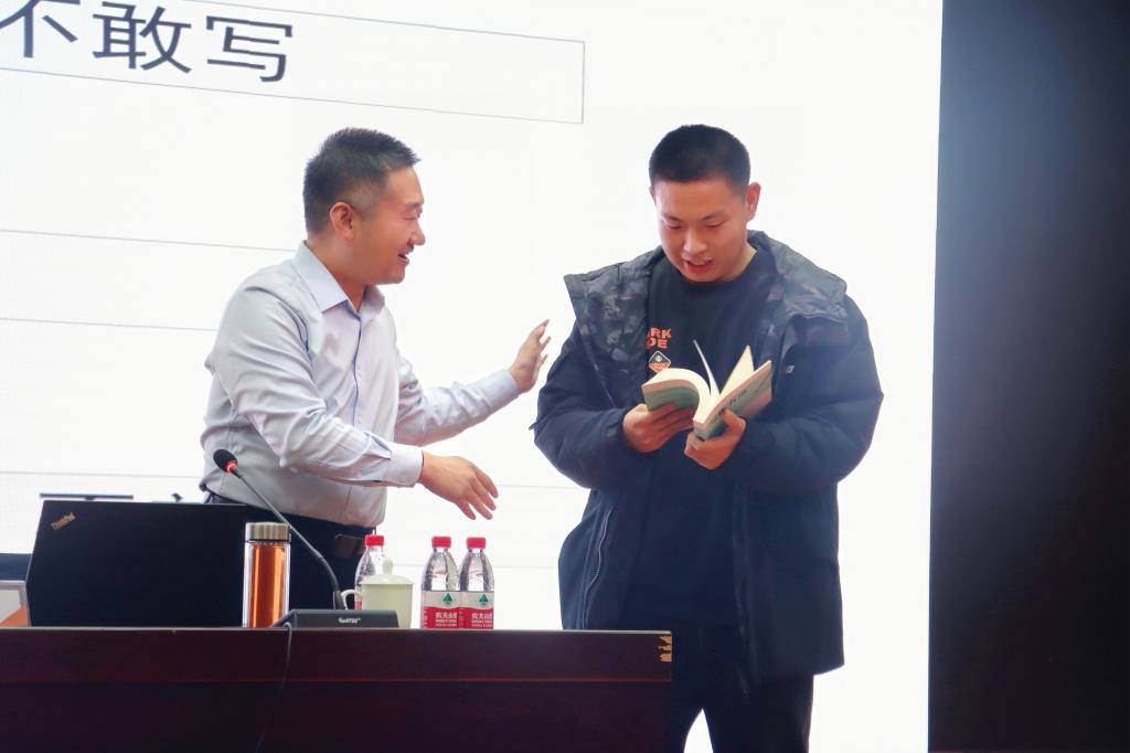 面对同学们的提问,刘老师以自身成长经验作答,在公文写作标题提炼、金句积累与创作、公文的逻辑架构方面给出了自己的见解,并分享了图书《写作有道》。