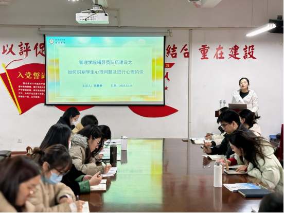 12月14日上午,心理健康教育中心受邀到管理学院,面向辅导员队伍开展《心理约谈及心理问题识别》专题培训,此次培训由黄静静老师主讲,管理学院行政秘书魏瑶及全体辅导员参会。