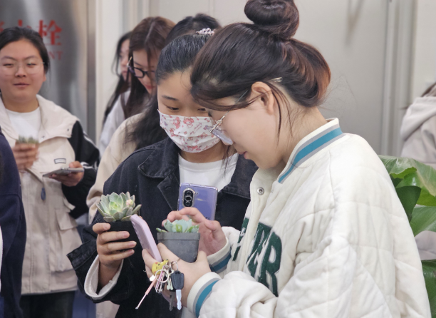 早春的暖阳下,几百盆绿植盛装打扮,期待着一场与主人的邂逅。本次活动将关照绿植与自我关照相结合,通过到梦空间自愿报名的形式参与。在绿植领养活动举办期间,学生们情绪高涨,人头攒动,早早就排起了长队,在工作人员的帮助下,大家竞相“Pick”了自己心仪的植物,并咨询了所获植物的养护指南与注意事项,同学们积极在活动群内互相交流,在朋友圈中打卡记录,分享与绿植的亲密瞬间,广泛宣传绿植领养活动,领取绿植后,大家纷纷表示,要悉心照顾自己的伙伴,呵护它茁壮成长。