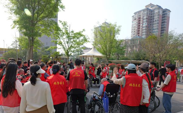 用青春搀扶夕阳,用爱拥抱世界。活动开始前,志愿者们将老人们推到残联公园,在春意盎然的风景中开展本次志愿活动。