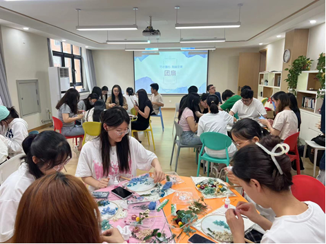 活动伊始,张老师就团扇的起源和历史发展过程向同学们进行了简要介绍,团扇是中国传统手工艺品,具有极高的艺术价值,凝结了中国传统文化内涵,象征幸福美好之意。接着,张老师讲解了团扇的制作方法。在张老师的引导下,同学们纷纷结合自身兴趣,发挥自己的创造力和想象力进行创作。或将画笔色彩巧妙地融合在一起,勾勒出自己独一无二创作画像;或巧手生花,赋予一朵朵干花全新的“生命”,为团扇增添“鲜活”的艺术气息。活动结束后,张老师邀请同学们互相交流心得,分享收获,探讨技巧,整场活动氛围融洽,充满着欢声笑语。