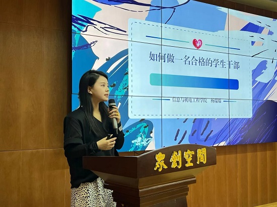 会议伊始,杨瑞瑞老师以“如何成为一名合格的学生干部”为主题与同学们进行交流。杨老师结合自身学生时期干部日常工作经验,围绕“学生身份和干部职业”,“服务同学和锻炼自我”、“收获经历和收获简历”、“志同道合的朋友和相互提携的伙伴”展开,深度剖析学生干部如何履行干部职责、如何解决工作中的困难、如何积累丰富经验、如何发挥榜样作用。最后,杨老师激励大家要具备“七种能力”,同时希望大家“让优秀成为一种习惯”,学会自我教育、自我学习、自我管理、自我服务,不断提升个人综合素养能力,更好地为同学们服务。