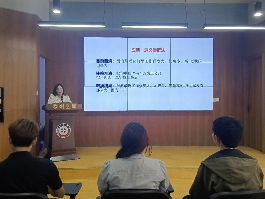 会议伊始,黄静静老师以“乌龟,乌鸦”热身活动提高学生注意力。接着黄老师结合从压力源,压力管理,积极心态三个方面展开,通过趣味小故事“秀才赶考”,“造句练习”,“意义换框法”等,深入浅出地讲解了如何认知和调整自己的情绪以及保持良好的心态。