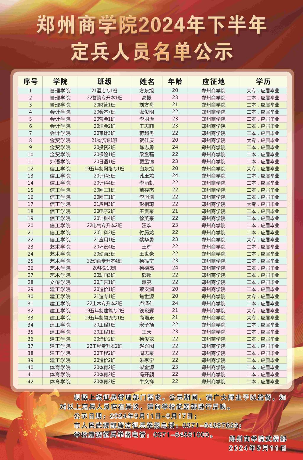 经过“网上报名、体格检查、心理测试、政治考核、役前教育”等环节,巩义市征兵工作领导小组定兵会议研究通过,确定beat365方东旭等42名学生为2024年下半年应征入伍定兵对象,现根据相关规定予以公示,人员名单如下: