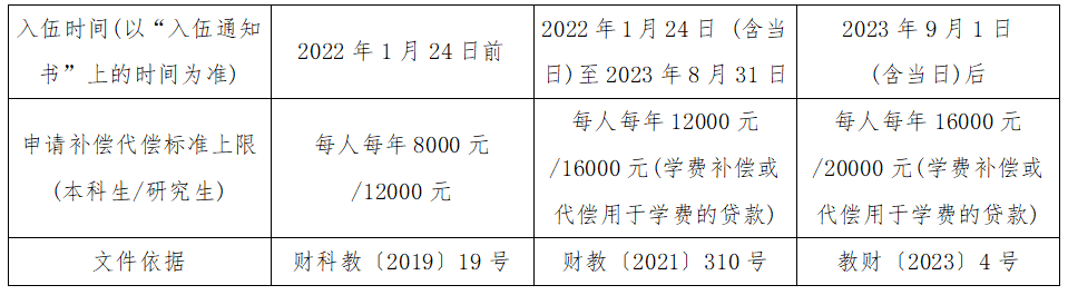 2.自2023年秋季学期开始,学费补偿、助学贷款代偿和学费减免标准最高按本科生每生每年16000元执行。其他年度申请学费补偿、贷款代偿的按照入伍时间对应的资助标准执行(详见下表);符合学费减免条件的退役士兵申请学费减免按照申请年度的资助标准执行。19号文发布之前的学费减免,仍按当时的标准执行。