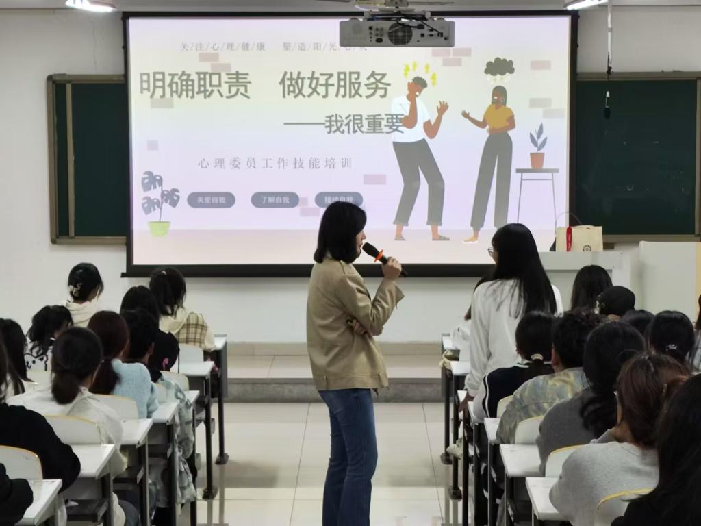 为提升心理委员的专业能力,更好地服务班级同学,建设一支具有较高水平心理自助与助人能力的朋辈心理辅导队伍,心理健康教育中心于10月18日下午在广恩楼对2024级新生心理委员开展了第一期专业技能培训,主题为“明确职责 做好服务 我很重要”,本次培训由心理健康教育中心李云佳老师主讲。