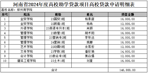 根据《河南省教育厅国家开发银行河南省分行关于2024年度高校国家助学贷款工作有关问题的通知》(教资助〔2024〕141号)文件精神,经个人申请、学院初审、校学生资助管理中心复核,现将2024年度高校国家助学贷款审批名单公示如下: