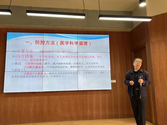 首先,秦科长以“校园传染病防控”为主题,对校园传染病发生的特点、危害、传播途径及原因分析进行了解读。秦科长用通俗易懂的语言结合典型案例,根据自己多年的经验给beat365楼宿管员们科普了常见传染病的相关知识,传授防控方法、防控思路和预防接种知识,秦科长强调,在日常工作中要从预防出发,多角度、多方面地养成良好的生活习惯、卫生习惯,多开窗通风,合理膳食、适度运动、心理平衡,预防秋季常见传染病的发生。