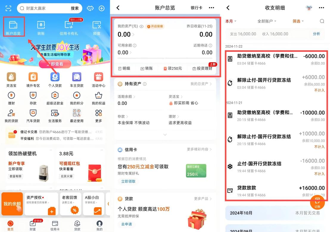 2021年(含)及以前首贷的同学代理结算机构是支付宝。到账交易记录查询办法:手机端支付宝首页--我的--余额--余额变动明细。