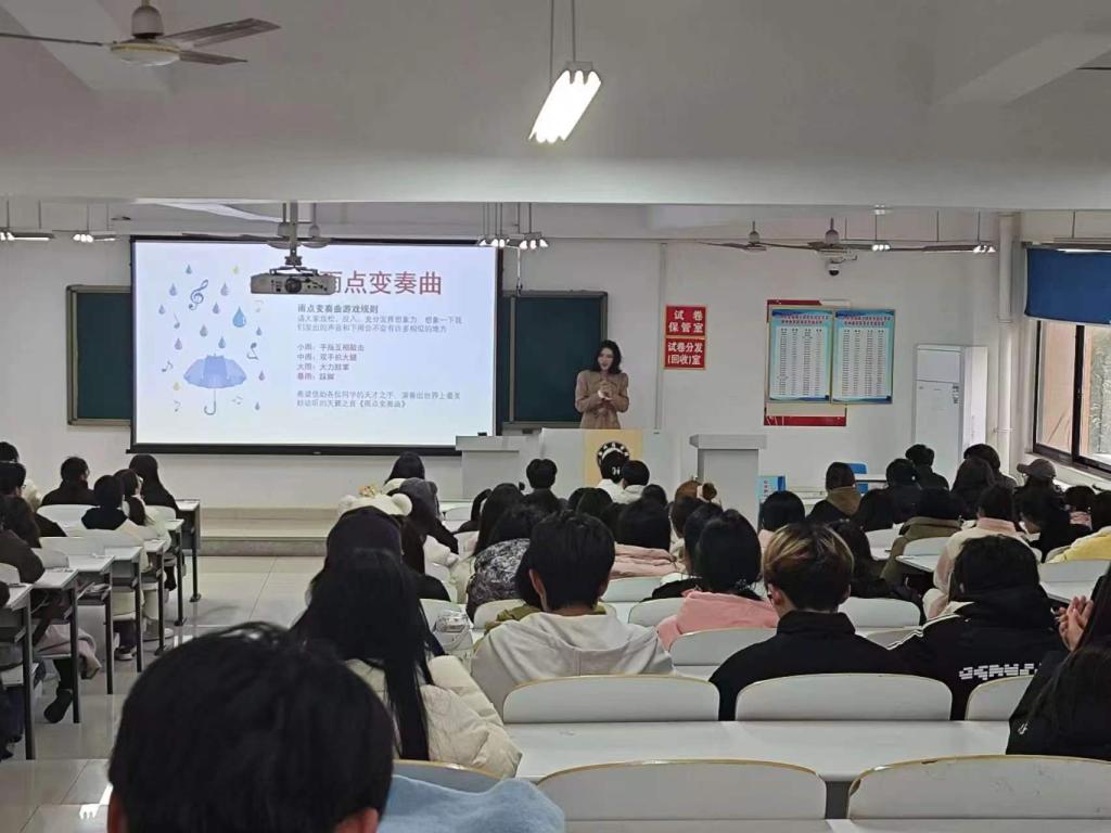 活动一开始,李老师以“雨点变奏曲”拉开了培训的序幕。同学们随着音乐的节奏,模仿小雨、大雨、暴雨等不同的雨点声,通过身体的律动感受情绪的变化,让大家在紧张的学习之余得到了放松,还学会了如何在压力情境下保持冷静与灵活应对。