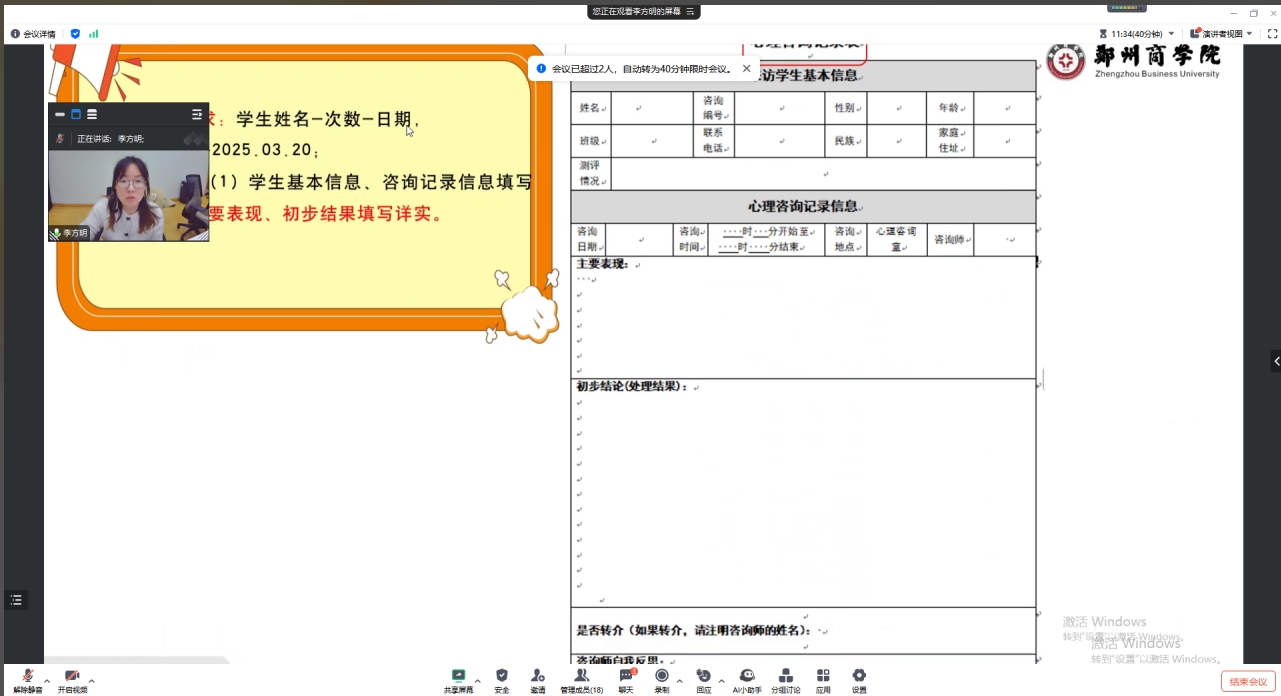 培训伊始,科长刘思楠首先说明了本次培训会的目的,其次强调了咨询伦理与原则在心理咨询工作中的核心地位,关乎每一次咨询的成效与师生的心理健康福祉。随后由心理健康教育中心教师李方明围绕学校心理咨询规范和流程展开讲解:为了更好了解师生需求,保护师生权益,在进行咨询之前,心理咨询师需向来访者说明心理咨询的伦理原则及规范,说明保密及保密例外原则,共同签署知情同意书,指导来访者填写心理咨询登记表等。专兼职心理咨询师们结合自身工作中遇到的困惑提问,如“当来访者信息涉及第三方安全时如何平衡保密与责任”等。针对这些问题,共同探讨出专业且细致的解答,引导大家从不同角度思考伦理问题的处理方式,拓宽解决思路。
