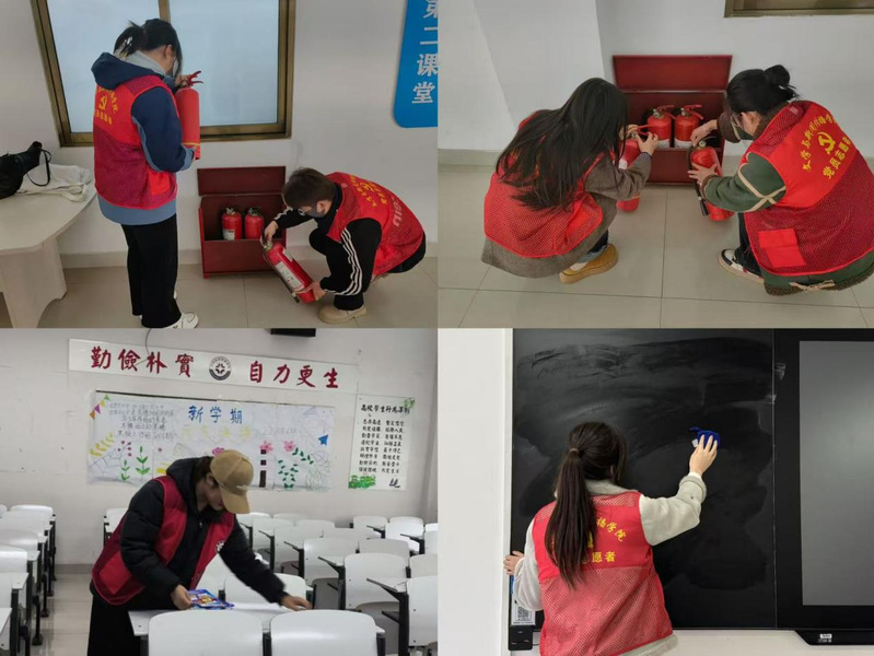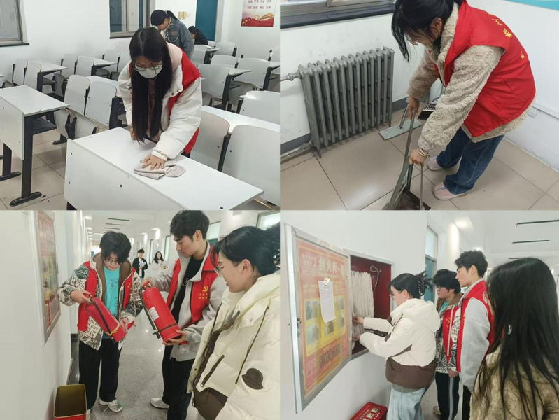 各二级学院积极响应,组织有效,全面排查了教学楼内消防设施,确保灭火器、消防栓等关键设备齐全无损;同时对教室门窗、蜘蛛网等卫生死角进行了彻底打扫,清理教室内杂物;落实“一分钟环保”,引导学生课后带走身边垃圾、整理桌面,培养良好卫生习惯。
