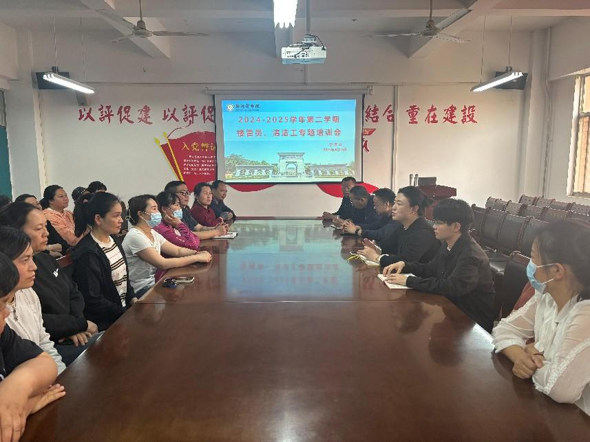 为进一步提升教学楼服务管理质量,持续做好校园卫生工作,营造安全舒适卫生的校园环境,学务处劳卫科于2025年4月16日在二号楼206会议室组织召开楼管员、清洁工专题培训会议,并对近期重点工作进行了安排部署。