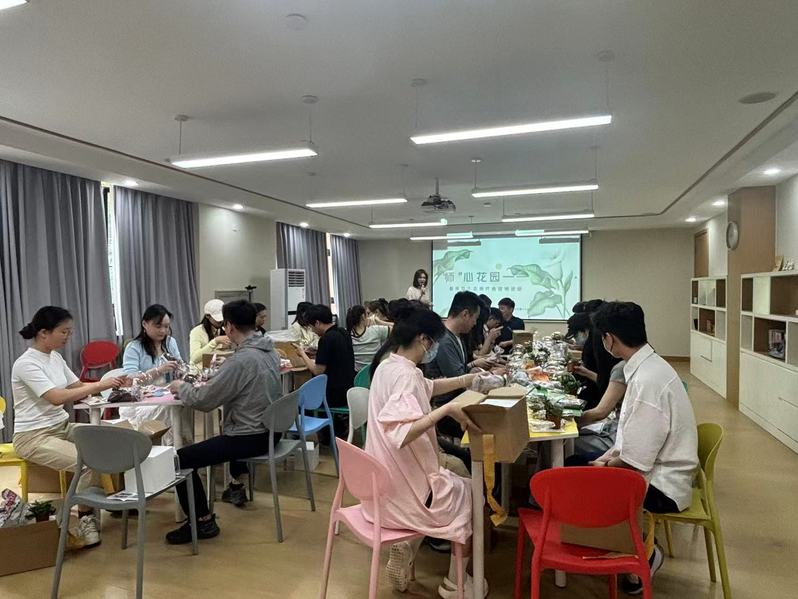 活动在温馨愉悦的氛围中展开,伴随着舒缓的音乐和引导语,李老师带领大家进入正念冥想环节,帮助老师们暂时放下工作的疲惫,进入放松状态。一花一世界,一叶一菩提。在理论讲解环节,李老师从心理学角度阐释了微景观创作的疗愈价值,指出方寸之间的生态构建能培养专注力、调节情绪。活动现场准备了丰富多样的植物和装饰材料,老师们化身为“微观造梦师”,用砂石堆叠山峦,以绿植打造花园,创作出各具特色的生态瓶作品。分享环节中,老师们纷纷表示:“专注创作时烦恼自然消散,看着瓶中生命成长,更深刻体会到教育就是要为每个学生营造适合的成长空间。”这一方小小的生态世界,不仅带来心灵的宁静,更启发了育人工作的新思考。