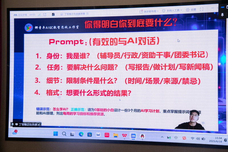 其次,古老师从认知到实操层层递进,通过解析大模型“理解-生成-推理” 三大核心能力。其次,古老师强调辅导员需把握“提示词即交互语言”的本质,现场演示通过“角色设定 + 场景描述 + 输出要求”构建高质量的黄金公式。接着,古老师分享了构建“辅导员创意决策+AI 执行落地”的模式方法,并带领现场老师们深入浅出的进行应用场景实操,不仅使全场教师受益匪浅,还加深了教师对AI技术的认知。