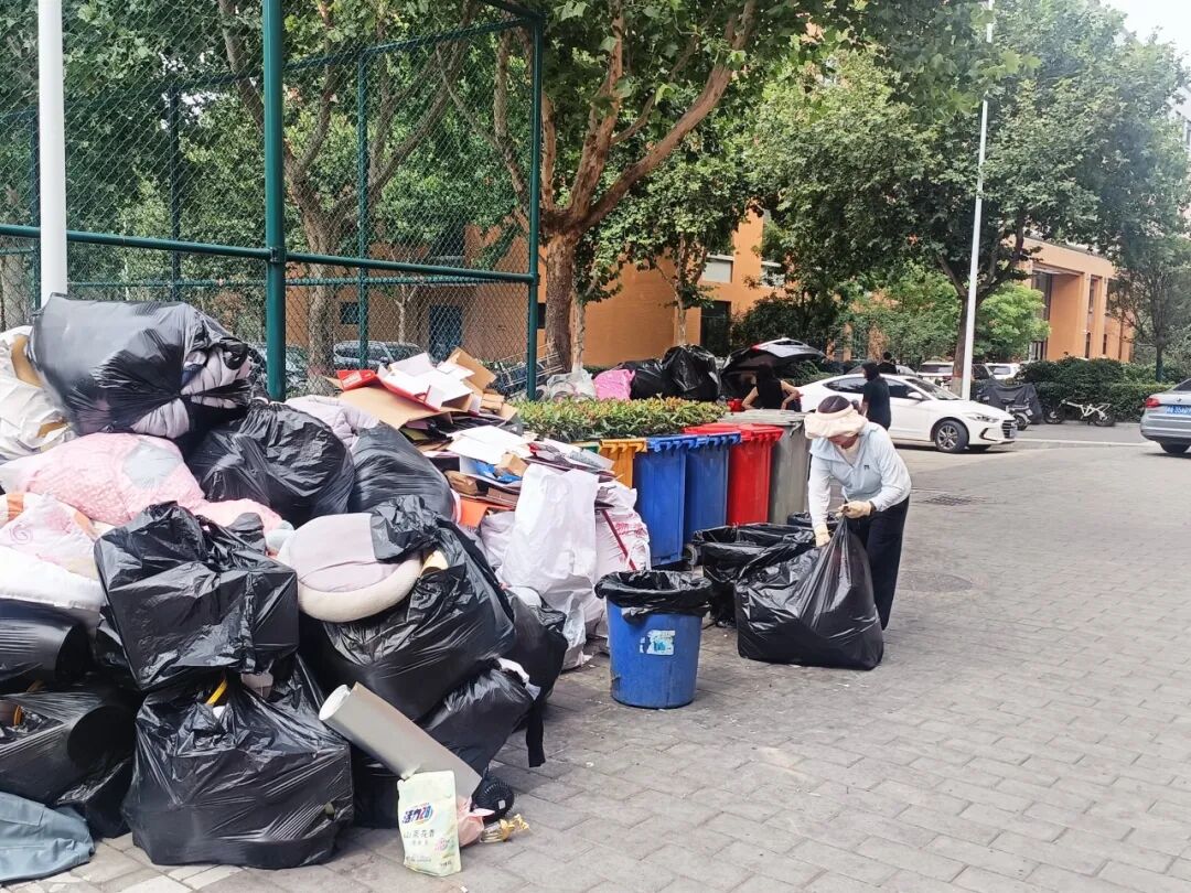 面对离宿期间骤然增加的行李搬运与环境卫生清理压力,宿管老师和学生干部积极协助毕业生搬运行李,安全高效地将沉重包裹、大件物品运送至宿舍大厅,有效缓解了毕业生的离宿负担。另一方面,为维护宿舍公共区域的整洁畅通,宿管老师们全力投入环境清理工作,协助毕业生整理废弃物品,打包堆积杂物,并统一清运至指定堆放点。在离宿期间加强了对楼道、公共区域的重点清扫,确保环境整洁有序。同时,学生干部逐一回收并登记毕业生退还的空调遥控器与宿舍门钥匙,认真清点核对宿舍公共物品清单;并积极引导人流、维持秩序,耐心解答疑问,保障了离宿工作的高效、平稳进行。