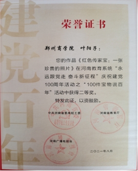 为庆祝中国共产党成立 100 周年,回顾党的光辉历程,讴歌党的丰功伟绩,弘扬时代精神,艺术学院精心组织、积极参与由省教育厅开展的“永远跟党走 奋斗新征程”庆祝建党100周年活动,此次活动中我院叶阳子同学在“100年宝物说百年”活动中,作品《红色传家宝:一张珍贵的照片》荣获二等奖、张亚浈同学在“1岁致敬100岁”活动中,作品《我的入党故事》荣获三等奖。