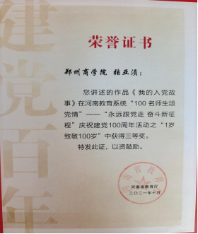 为庆祝中国共产党成立 100 周年,回顾党的光辉历程,讴歌党的丰功伟绩,弘扬时代精神,艺术学院精心组织、积极参与由省教育厅开展的“永远跟党走 奋斗新征程”庆祝建党100周年活动,此次活动中我院叶阳子同学在“100年宝物说百年”活动中,作品《红色传家宝:一张珍贵的照片》荣获二等奖、张亚浈同学在“1岁致敬100岁”活动中,作品《我的入党故事》荣获三等奖。