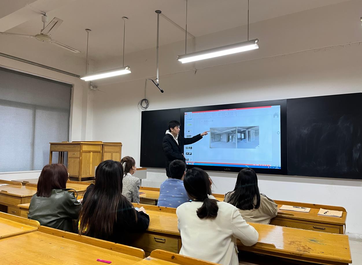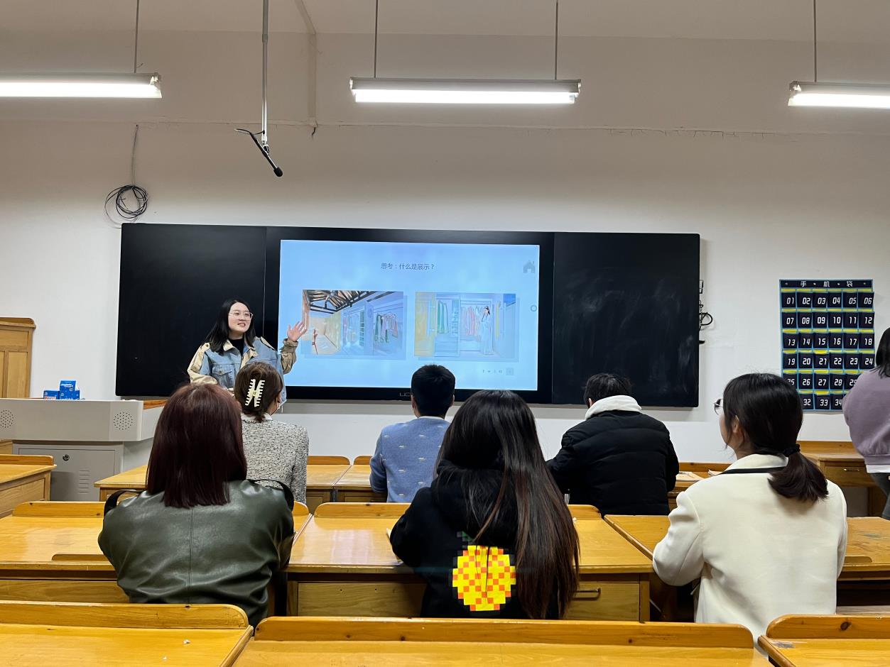 随后,新进教师分别进行了约十分钟的模拟教学。李玫欣老师从展示空间出发,简单探讨了不同空间展柜的陈列方式;谢各各老师向在场的老师展示了《人体工程学》课程的大纲设计与思路;孙哲老师以“看图建模”为主题,通过“居住空间中的梁”为实践案例进行了讲解。