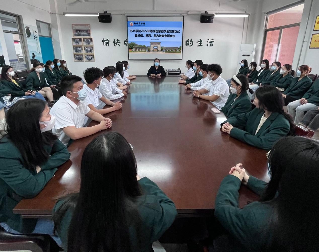 为深入贯彻“资助育人”理念,培育学生诚信感恩意识,营造自强不息、奋发图强的氛围。2022年4月11日,艺术学院在艺术大楼二楼会议室召开“艺术学院2022年春季国家助学金发放仪式”暨诚信、感恩、励志教育专题会议。