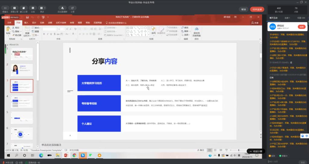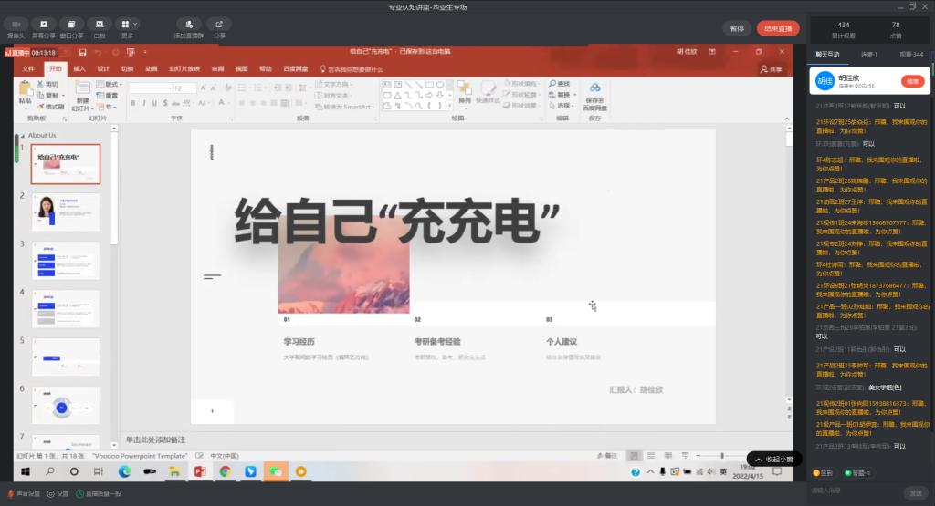 4月15日晚,beat365优秀毕业生胡佳欣通过钉钉直播作《给自己“充充电”》为主题的报告。