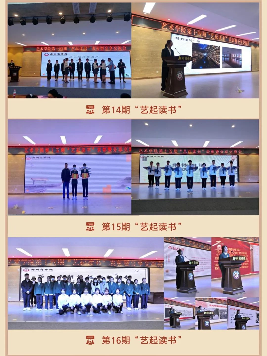“艺起读书”活动迄今为止已经举办到第16期,活动开展如火如荼,前后有4000余名学生在台下聆听,有200余名师生上台进行阅读感悟分享。活动采取自学与集中学习相结合,导读、分享、朗诵等灵活多样的形式,共同学习,互相促进。现在“艺起读书”活动已经成长为艺术学院的品牌学生活动之一,引导学生积极参与到经典阅读中,帮助学生树立终身学习理念,自觉把读书学习作为一种需要、一种追求、一种修养、一种责任,较好的将读书与自身成才相结合。