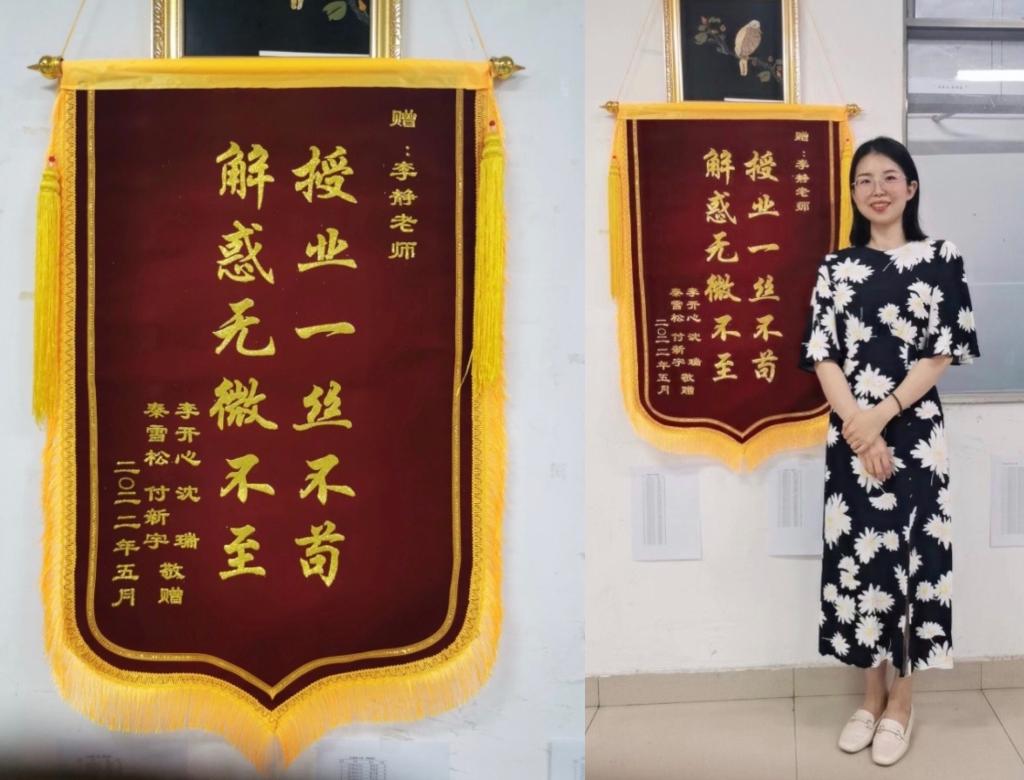 2022年5月24日下午艺术学院视觉传达设计教研室收到了一份特殊的礼物,毕业生将一面“授业一丝不苟,解惑无微不至”的锦旗送给了李静老师,突如其来的惊喜让老师备受感动,收到锦旗那一刻感觉所有的疲惫感都消失了,一切都被学生的肯定变的有意义。在六年的教育工作之中,李静老师始终谨记学校创办人提出来的“三心”,要富有“关心、爱心、耐心”,做到对学生的爱是无私的、平等的,就像父母对待孩子,兄长对于姐妹。做到“三心”的同时还要做到“三严”,“严管、严教、严考”,这样才能保证我们的教学有条不紊,成果显著。她常告诉学生,人生就是不断学习不断成长的过程,踏踏实实做人,认认真真做事,总会遇到更好的自己。