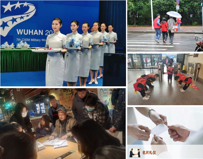 会上,同学们就文明礼仪基本概念和类别纷纷发表了自己的见解。随后,冯上瑄同学首先向大家分享了2019年世界军人运动会上礼仪小姐颁奖时的照片。他说道:中国礼仪小姐展示的站姿礼、微笑礼、服务礼和仪容仪表礼,能让世界更直观的了解中国文明礼仪,而服装得体,面带微笑,仪态端庄也正是我们日常生活中所需要具备与保持的基本社交礼仪;崔海博和杜婷婷同学分别分享了暑假拍摄的志愿者照片,他们认为在人们交际中,文明礼仪是不可或缺的,是不可过于计较的,正是这些看似不经意的举动,才更能体现出良好的自我修养与自我价值;闫乃香同学分享了自己的名片礼仪,她提到:递交名片时应该双手拿名片,且名片正面面向对方,名片礼仪是商业礼仪中的一种,在商务活动中占据不小的比例,良好的礼仪更有助于建立良好的人际关系;李若凡同学分享了她拍摄的校园学习交流会照片,照片中同学们积极主动的请教老师问题和老师的耐心讲解,无一不体现出了校园内良好的文明素养与师生礼仪。