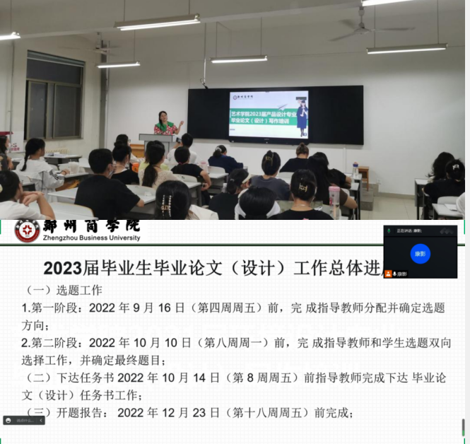 为更好的开展毕业设计(论文)工作,保证2023届毕业生毕业设计(论文)工作的顺利进行,2022年9月9日-15日,艺术学院各专业针对2023届毕业生毕业论文(设计)的写作开展了一系列专题培训。根据学生的实际情况,采用线上线下相结合的方式进行,分别由环境设计专业马前进副教授、视觉传达设计专业吴华堂副教授、产品设计专业张振中副教授和动画专业焦博老师主持召开,艺术学院2023届全体毕业生和指导教师参加了本次系列讲座。