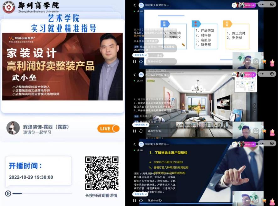 活动第二讲邀请到小店整装运营落地导师武小垒作为主讲嘉宾,为环境设计专业的同学带来了“家装设计整装产品”专题讲座。武老师注重理论与实践相结合,从不同方案的平面设计、施工效果、成本控制等方面来进行详细讲解,并佐以详细真实的项目实景照片来深化阐述,以通俗易懂而不失幽默的讲课风格分享多年的设计和实战经验,展示了市场一线的材料、施工技术和家装设计整装产品。他的分享引起了同学们对未来工作的无限憧憬与展望,并对自己职业生涯的规划有了更明确的努力方向。最后,同学们积极与老师互动交流,并将自己在实习就业中遇到的困难与老师进行探讨,武老师一一进行了指导解答。