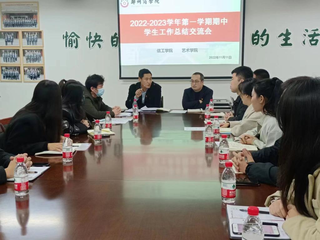 为深入学习贯彻党的二十大精神,提升学习实效和工作水平,提高辅导员的业务素质和职业能力,艺术学院与信工学院于2022年11月11日上午,在艺术大楼二楼会议室召开了2022-2023学年第一学期期中学生工作总结交流会,艺术学院党委书记李帅、信工学院党委书记周余及艺术学院、信工学院全体辅导员老师共同参加。