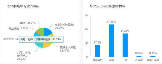 根据调研数据显示:在专业满意度方面,有58.47%的学生根据个人兴趣通过自己搜集资料,对专业有一定的了解后自主填报的专业;有34.96%的学生选择时考虑未来就业前景广阔的专业;29.59%的学生是根据专业的冷热程度考虑到未来就业而选择的专业,总体上学生们对自己的专业满意程度有17.3%是非常满意,47.26%是满意,34.25%是一般,不满意和非常不满意的占到1.2%。