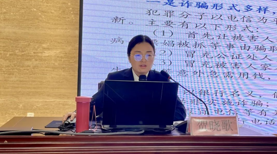 讲座开始,贺主任首先明确了什么是电信诈骗,即以非法占有为目的,利用电信网络技术手段,通过远程、非接触等方式,诈骗公私财物的行为。她指出如今电信诈骗案件呈迅速上涨的形势,电信诈骗形式多样、手段花样翻新、结伙作案、分工明确、发案率高,危害性大等多种特点,由此引出了该类犯罪蔓延迅速的原因。