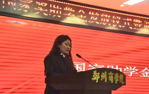 接下来由本次获得国家助学金学生代表栗思楠上台发言。她在发言中首先对学院领导老师的关心照顾表达感谢,并向各位获得助学金的同学们发出号召,希望大家合理安排收入支出,不盲目消费,不追求物质生活上的富足,树立正确的消费观,将助学金用到实处。