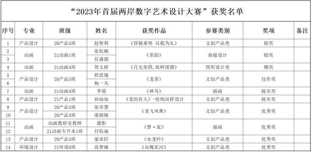近日,由海峡两岸交流促进会、台湾旅游和文化协会等协办的2023首届两岸数字艺术设计·年度奖获奖结果公布。我院师生斩获银奖2项,铜奖1项,佳作奖1项,提名奖2项,优秀奖4项的优秀成绩。