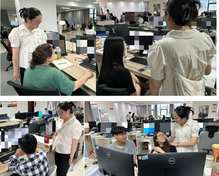 目前艺术学院共有28名优秀学子在该公司进行集中实习,积极参与到公司的多个核心项目中,将所学知识与实践紧密结合,展现出了艺术学院学子的专业素养和创新能力。胡颖辅导员特别关心同学们在实习期间的工作状态与成长,她逐一询问了每位实习生的工作内容、学习收获以及遇到的挑战,并鼓励他们珍惜实习机会,勇于面对困难,不断提升自我。