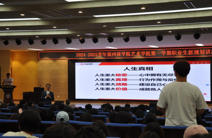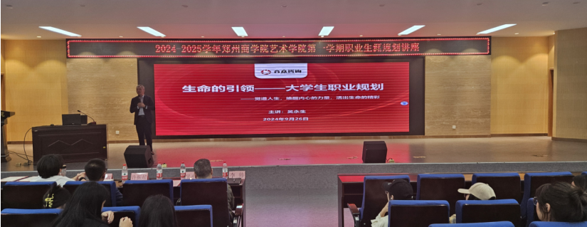 2024年9月26日下午,艺术学院在自力楼三楼报告厅迎来了一场别开生面的大学生未来职业规划讲座,本次讲座有幸邀请到了河南省黑龙江商会商学院院长、郑州合众企业管理咨询有限公司董事长吴永生先生,河南省黑龙江商会副会长、河南内在文化传媒有限公司CEO许振超先生,为广大学子指点迷津,规划未来职业道路。艺术学院院长李宪广、党委书记李帅,辅导员老师王怡力、王菊、董卓楠、朱牛牛、付欣欣、崔思奇、饶椿昊参加了本次会议,由学院就业专员赵天龙主持本次讲座。