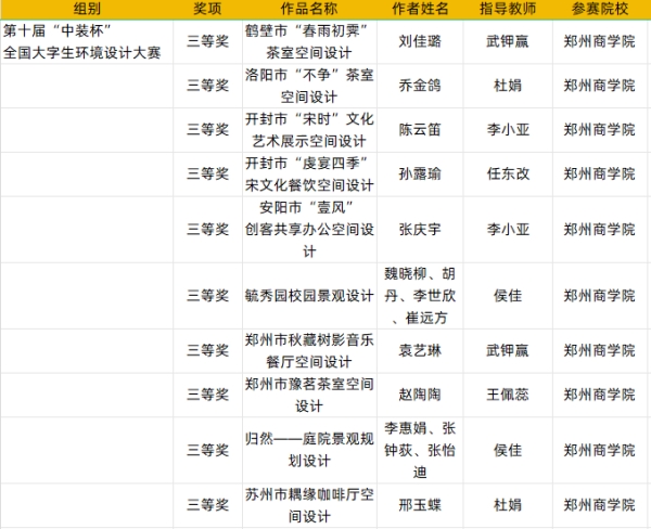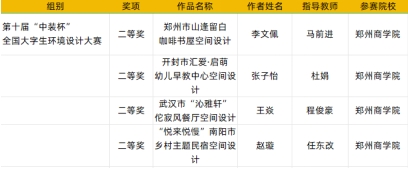 “中装杯”全国大学生环境设计大赛是一项面向全国在校环境设计及相关专业学生的公益性大赛,自2013年首届在清华大学启动以来,已连续成功举办九届。九届大赛共覆盖院校1000余所已成为具有广泛影响力的高校学生设计赛事。艺术学院师生在第十届“中装杯”全国大学生环境设计大赛中获省级二等奖4项、三等奖10项、优秀组织机构奖1项。