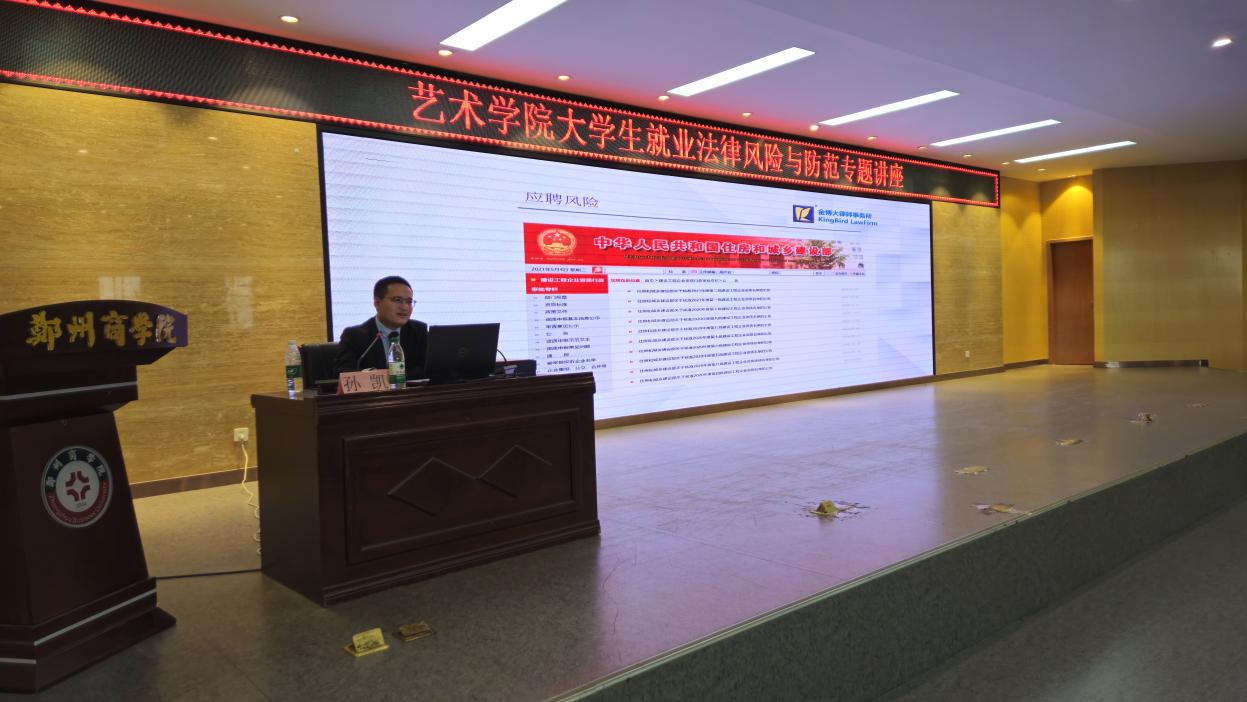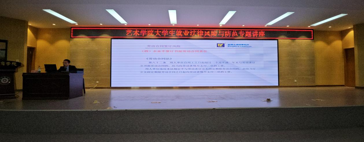 为了增强艺术学院学生的法律意识,提升就业过程中的自我保护能力,艺术学院特举办了一场以“大学生就业法律风险与防范”为主题的专题讲座。本次讲座荣幸地邀请了知名律师孙凯。由艺术学院就业专员赵天龙老师主持。