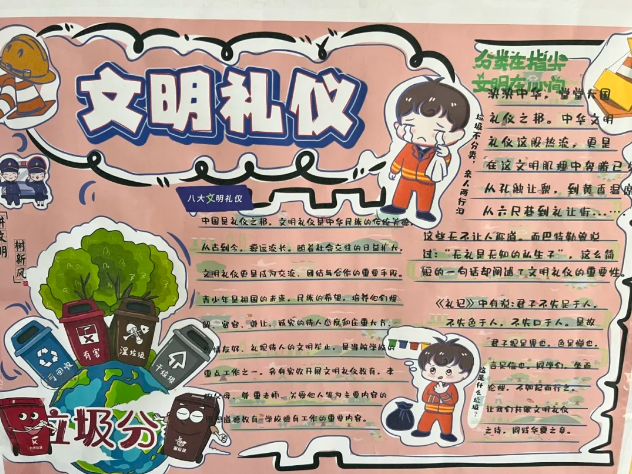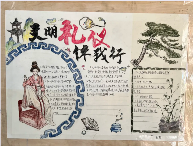 在大力宣传以及同学们的积极参与下,此次活动的作品,可谓是百花齐放,参赛同学把自己对文明礼仪的理解付诸于笔端,描绘于画纸之上,用优美的文字、生动的图画、独特新颖的版面设计,诠释了“文明”的意义。