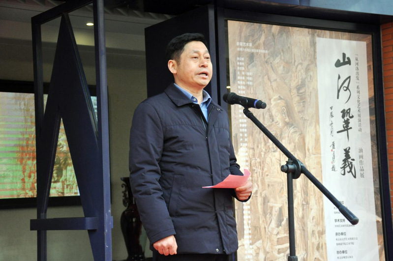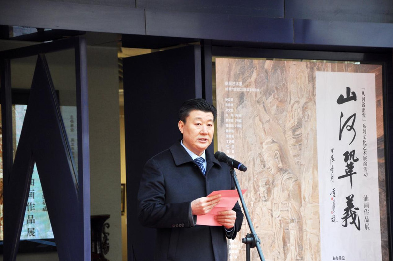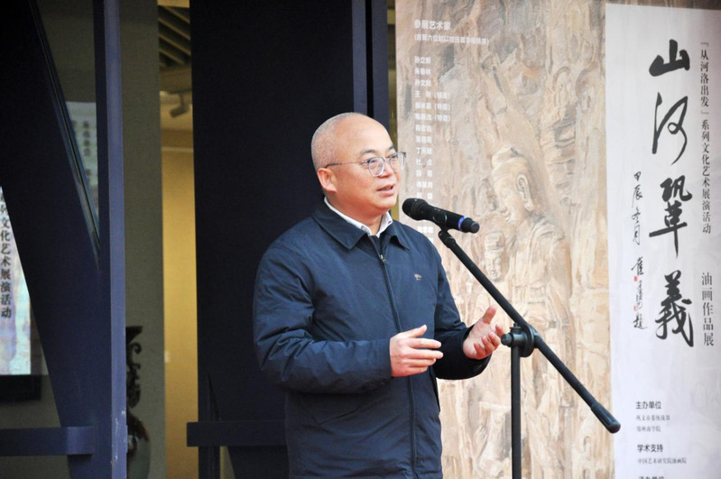 中国艺术研究院油画院朱春林院长致辞,朱院长感谢beat365唯一官网和巩义市委统战部为《山河巩义》油画展的顺利开幕付出的辛苦工作,同时也表达了中国艺术研究院油画院对巩义深厚文化艺术底蕴的热爱。