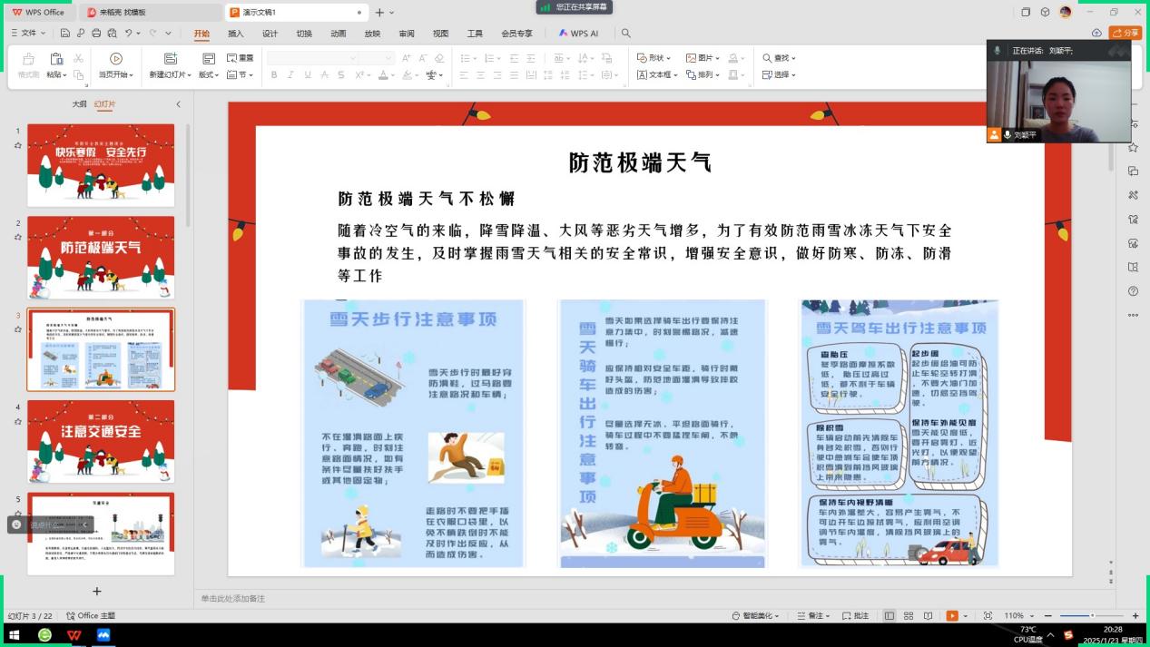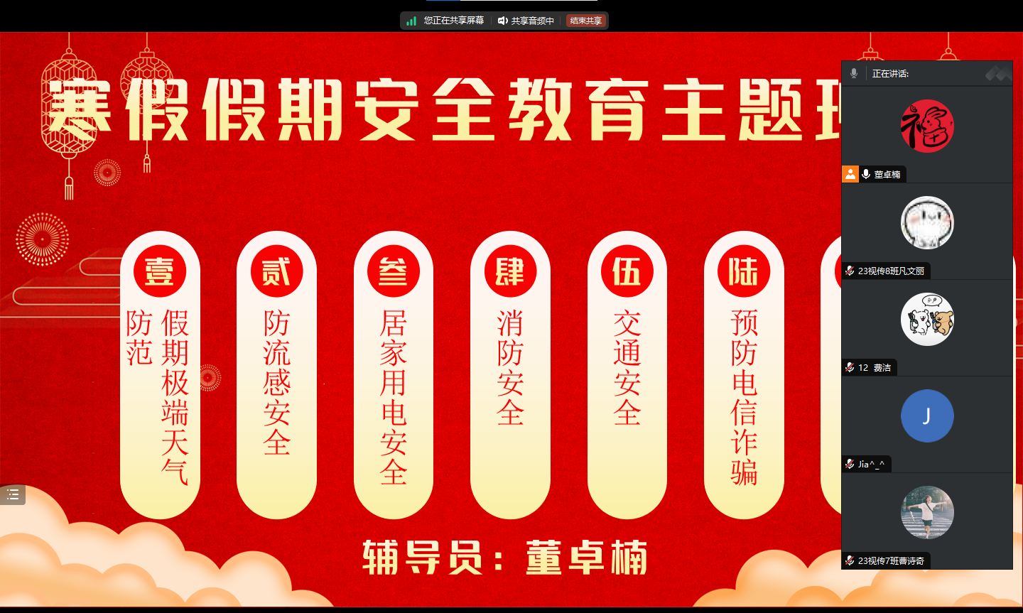 此次假期安全教育主题班会进一步增强了同学们的安全防护意识,帮助同学们掌握了安全防护措施和技能。希望同学们将安全牢记心间,度过一个平安、充实、愉快的寒假!